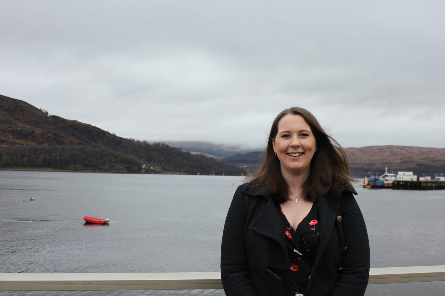 Emma Roddick stands smiling beside a misty Highland loch, with wooded hills and a small pier in the background.